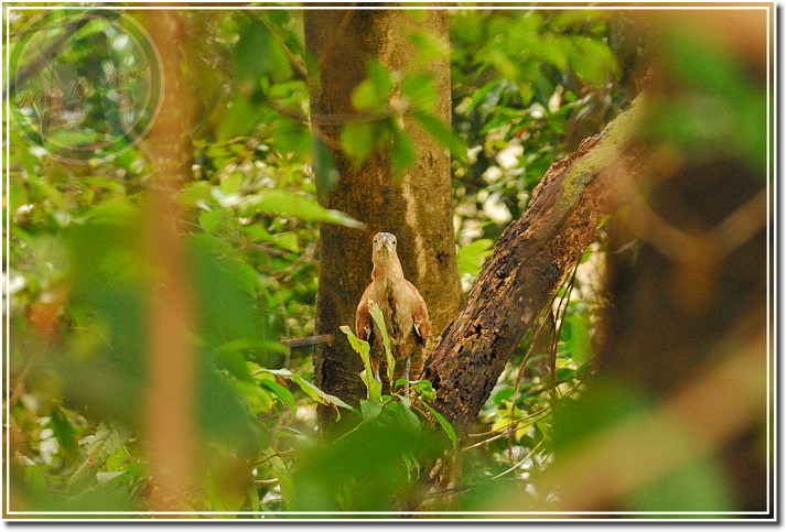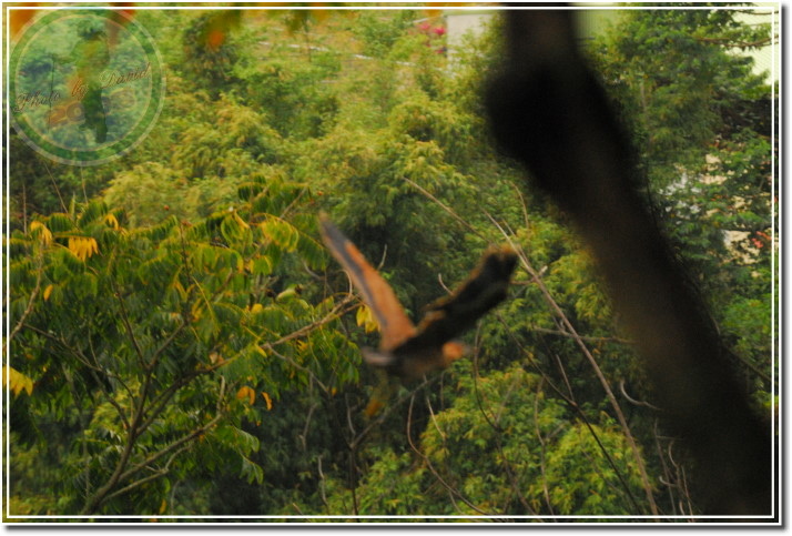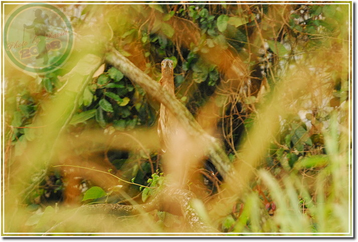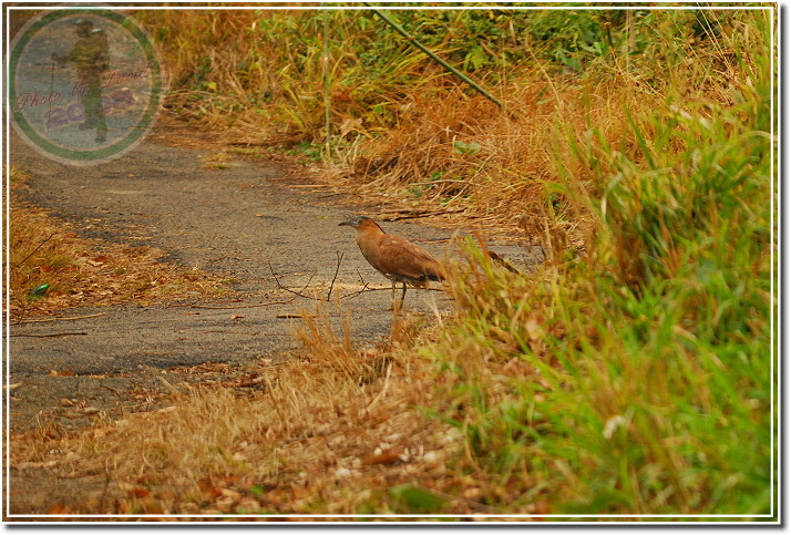 拍幾張之後,利用路旁坡崁遮擋潛進,在距離很近的地方伸出鏡頭搶拍,但麻鷺的手腳更快...「啪!啪!啪!」飛上懸崖的大樹枝頭。我在追上去,他往回飛到另一枝橫臥著樹幹上;我回頭蹲走著,他還是不斷盯著我看,他心中似乎有一條警戒線,只要我越過警戒線就飛回另一枝樹幹。來來回回好幾次。最後我孤注一擲地非常接近才現身,當然...他還是飛了,只是朝下更遠的飛去了。