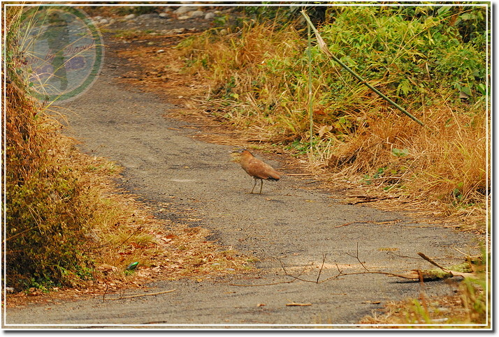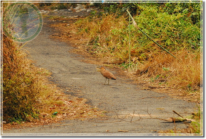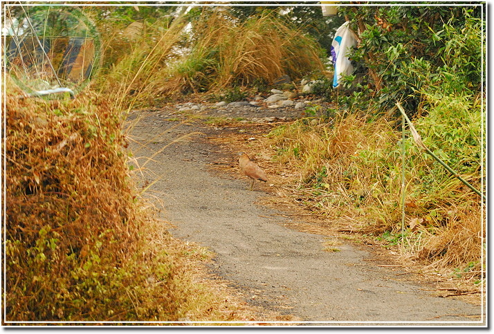 拍完人面蜘蛛,一轉頭就發現他鵠立在農路上盯著我看,也不知道盯多久了。這黑冠麻鷺應該是之前在這裡出出入入的那隻,當相機開始轉動,他也跟著緊張起來,頭低低的往前奔跑,跑一段路之後又停下來盯著我看。
