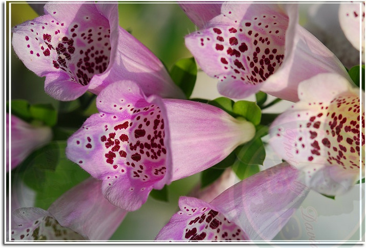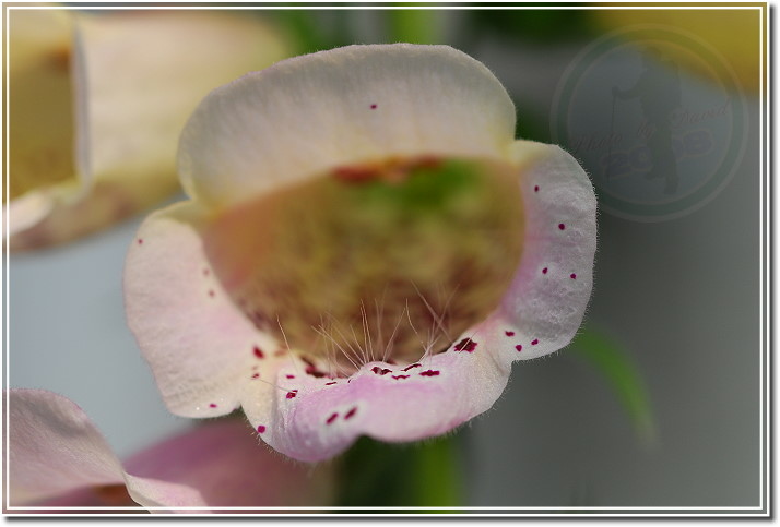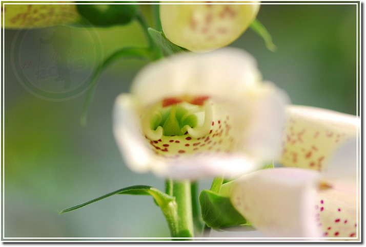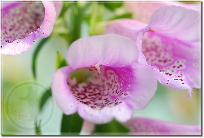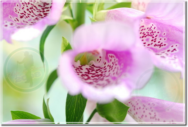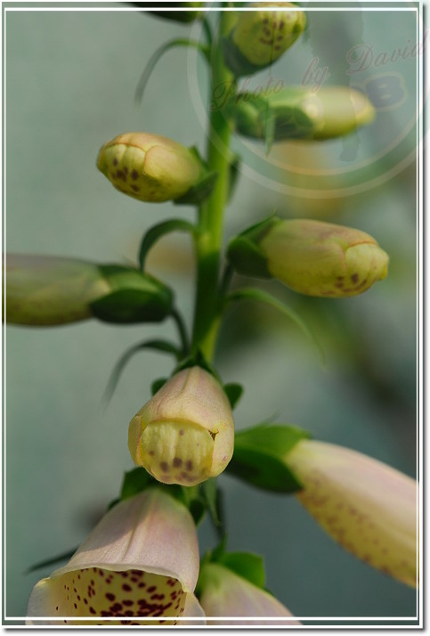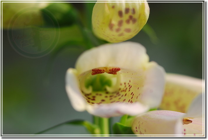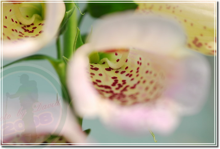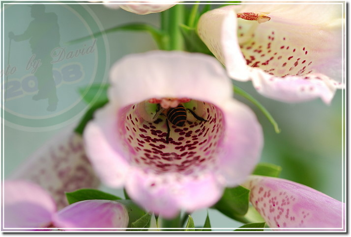 毛地黃的花稍稍下垂,正好讓每一朵花豔麗的唇瓣完全展現在目光下。當你想要跟著蜜蜂的足跡窺伺花朵裡的秘密,卻必須費力地完全趴到地上,鏡頭才能毫無阻礙地揭露一切。祇是蜜蜂動作好快,往往我還沒窩到底,他就完成工作退出來。