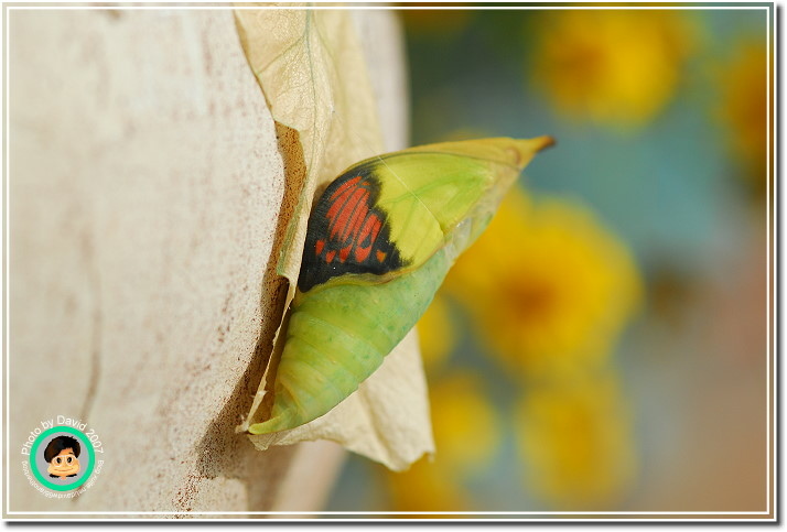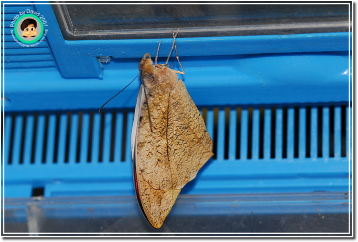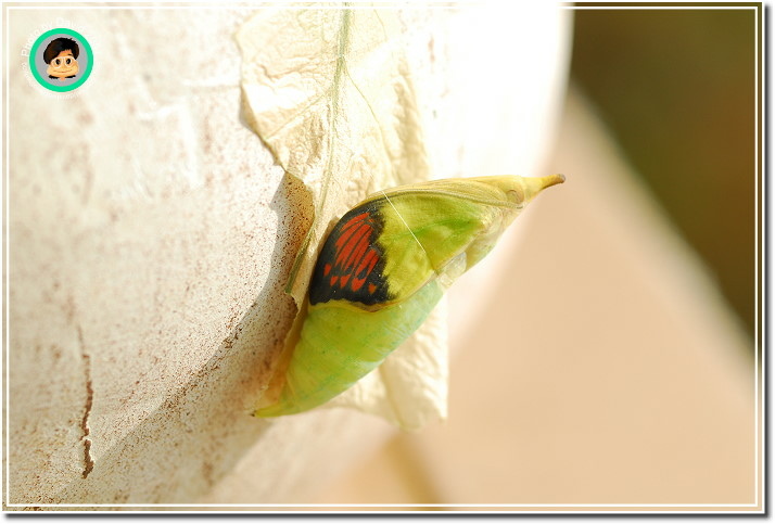 昨天一早端紅蝶就羽化了,仔細檢查其他幾個蛹,蛹上已經浮現紅斑,顯然也即將成熟了。