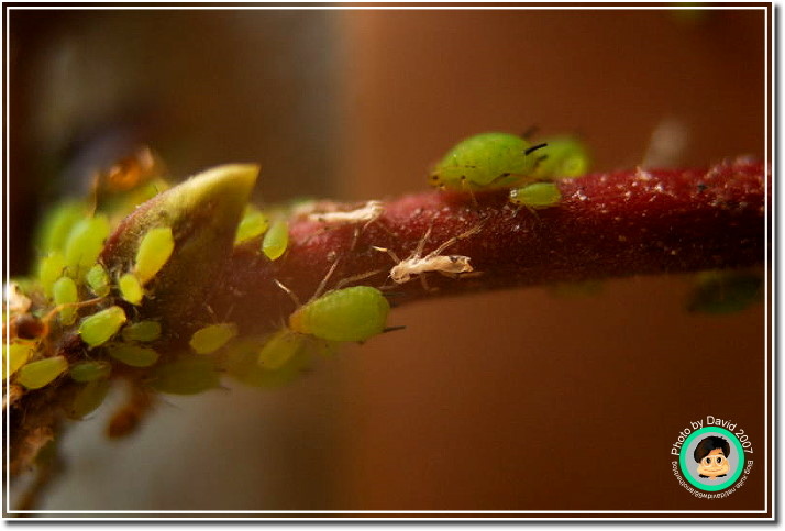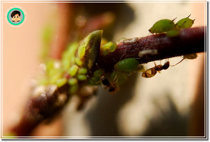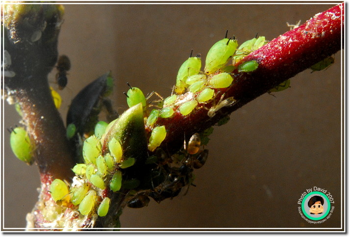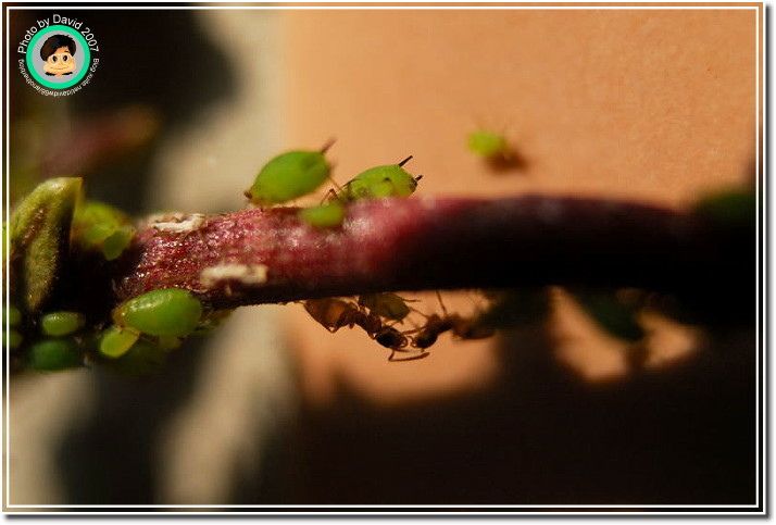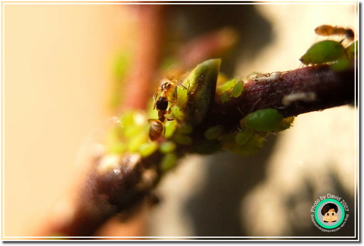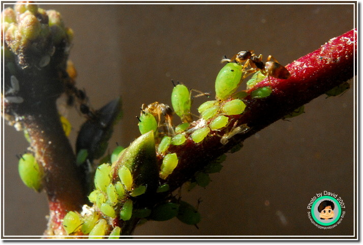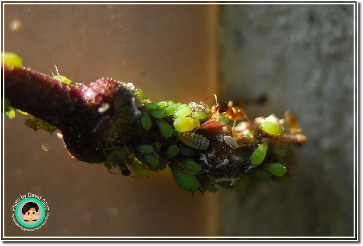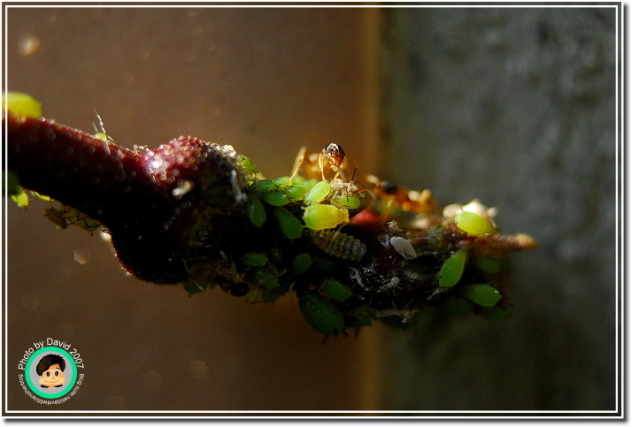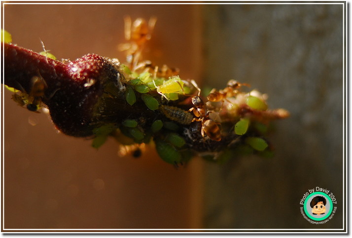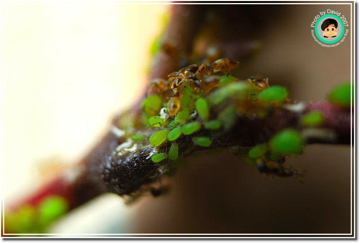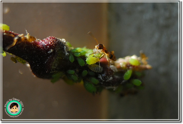 不過不管它是什麼芽蟲,肥嘟嘟、圓滾滾的樣子就是很可愛,尤其是放大之後,不再是密密麻麻一群,而是一團一團有趣的身材,顏色晶瑩剔透。加上共生的螞蟻忙碌地爬來爬去,像辛勤的牛仔一樣採收芽蟲分泌的蜜汁。很能夠吸引人細細地觀察。