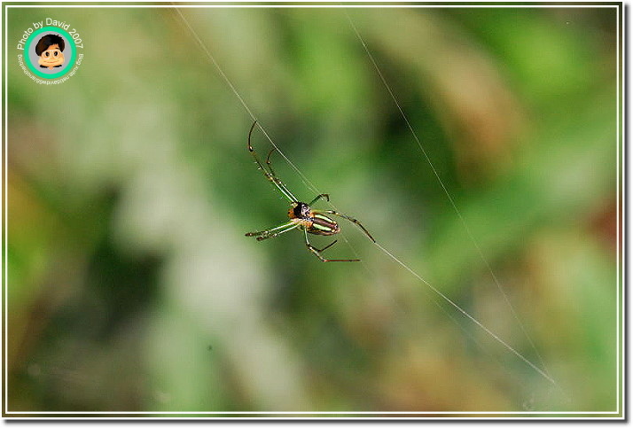 在穿棟林道拍中華珈蟌的時候,這隻「肩斑銀腹蛛」就在坡坎邊織網,不知道它是在補破網,還是像有些蜘蛛會在傍晚織網上工,到了清晨下班前會先收網,將網子重新吞回肚子裡。