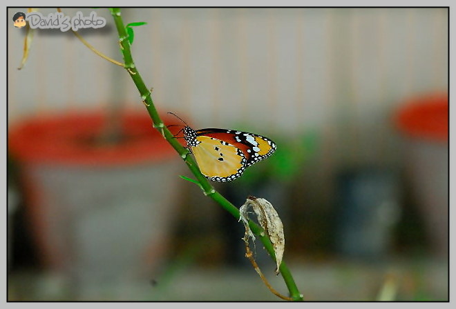 馬利筋被啃蝕殆盡之後,校園裡開始有樺斑蝶羽化飛舞,晨間就在驚呼中開始追逐蝶蹤。樺斑蝶在斑蝶中算是動作敏捷的,斑蝶媽媽不斷地移動位置尋找長出新葉的馬利筋。我由原先追逐式取景,改成在馬利筋周圍守株待兔,勉強補捉到這個畫面。心裡其實蠻後悔沒有帶200mm的近攝鏡來,不然就不必如此辛苦了。