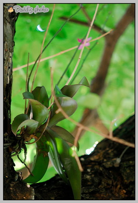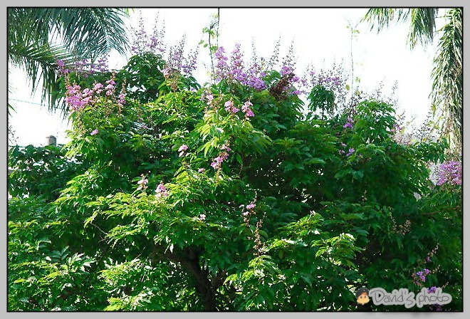 大花紫薇又叫「印度紫薇」,原產印度,與「紫薇」應該算是兄弟吧。這棵紫薇在我來這裡前就有了,至少也有2、30年的歷史。壯碩的樹幹、粗糙的樹皮適合蘭花攀附,所以上面綁了棵革質葉的蝴蝶蘭,今年也開花了,但隱身在濃密樹冠之下,很容易被忽略。