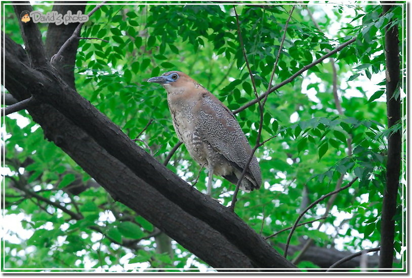 牠站在苦楝的枝椏上,現在出現應該與天氣陰濕,這裡又近似密林有關吧。臉上藍斑非常明顯,是辨認的重要依據。牠佇立不動,顯然對自己的保護色相當自信。