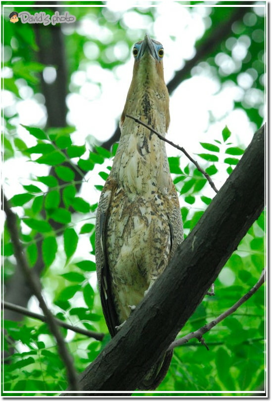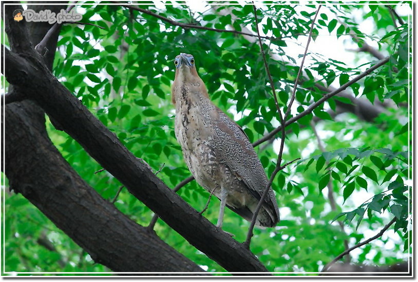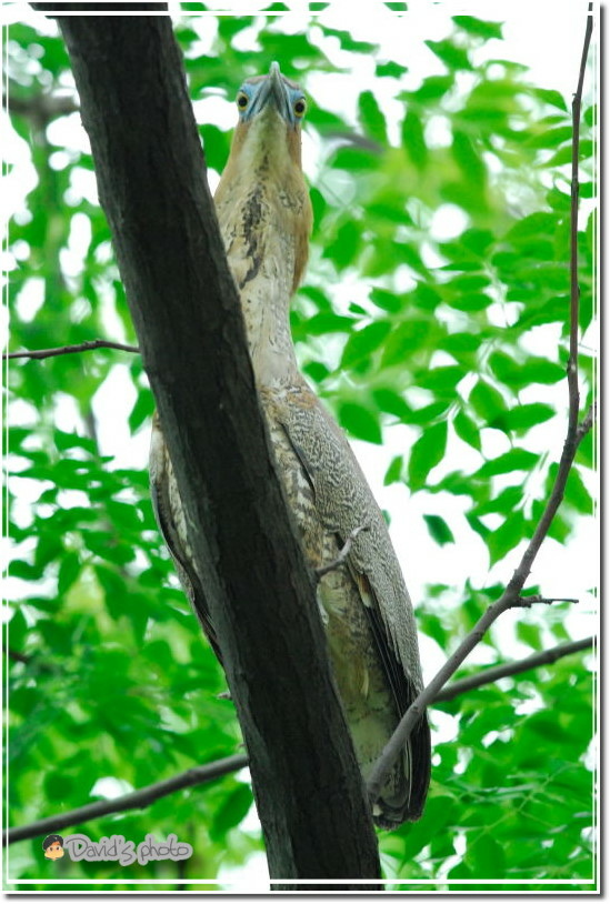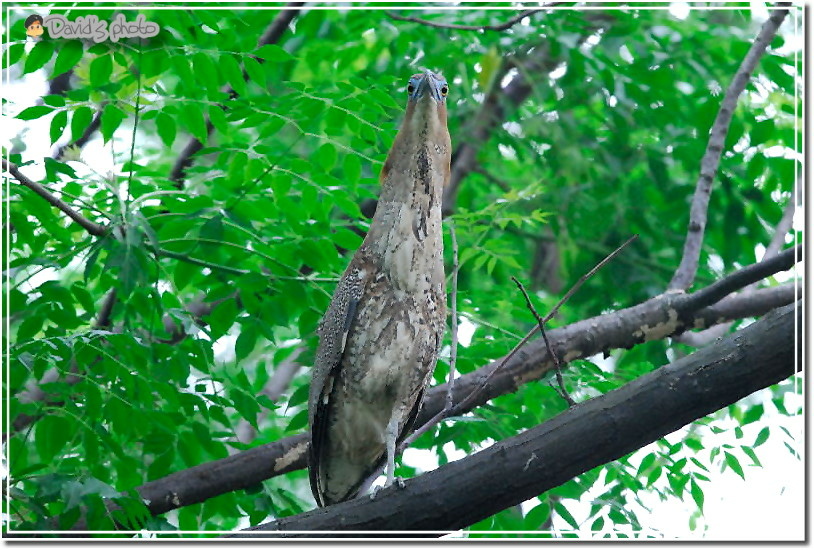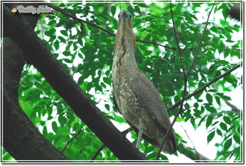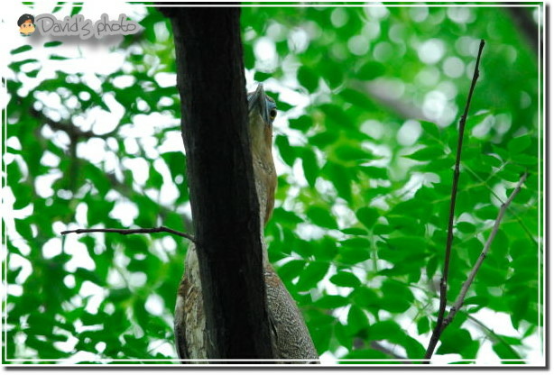 我以相機及DV交替地記錄,移動位置時他才伸長脖子凝視著我。能夠最接近他的位置在正下方,故意讓樹幹遮擋彼此的視線,果然牠還是不飛,反而偷偷地歪頭監視著我...好賊的鳥啊。