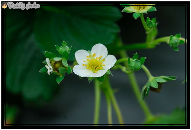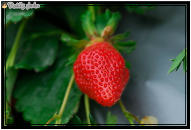 山腳下遍佈草莓園,路口人潮擁擠,越上頭的田裡只有巡行的老農。美麗的草苺花接二連三地綻放,飽含紅色的草莓成雙地掛在灰帆布上。沒時間來摘?取個影像純欣賞吧!