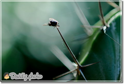 這隻蒼蠅不知何時掛在這針尖兒上,是壽終正寢?還是遭遇橫禍?巧的是抱緊針尖兒,儘管殘缺了還是固執地不願掉落。細細的仙人掌刺,映著朝陽,竟有淡淡的哀悽。
